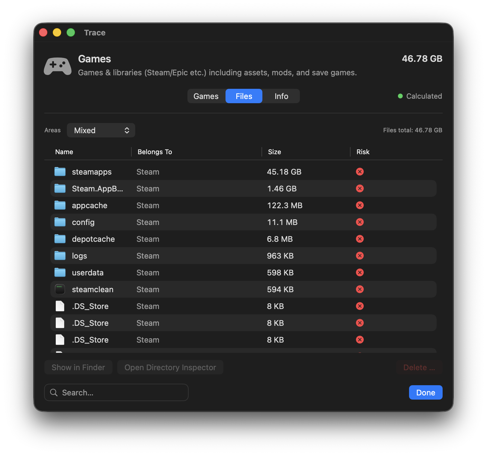 Game-Libraries aus Launchern (z. B. Steam) inklusive Assets, Mods und Savegames. Trace erkennt installierte Spiele sauber und zeigt sie getrennt von normalen Apps.
