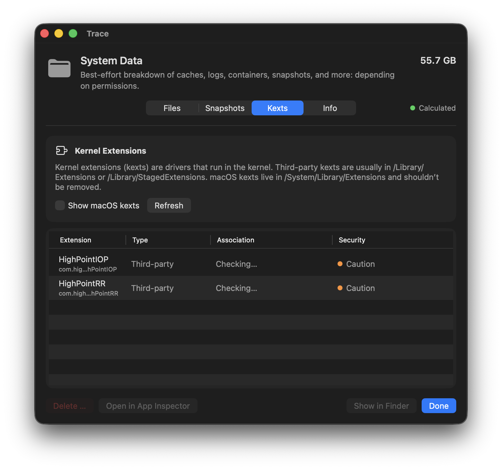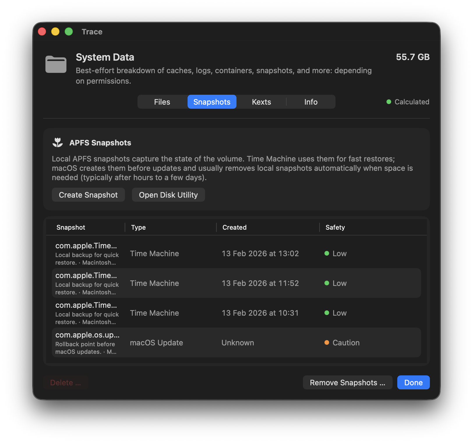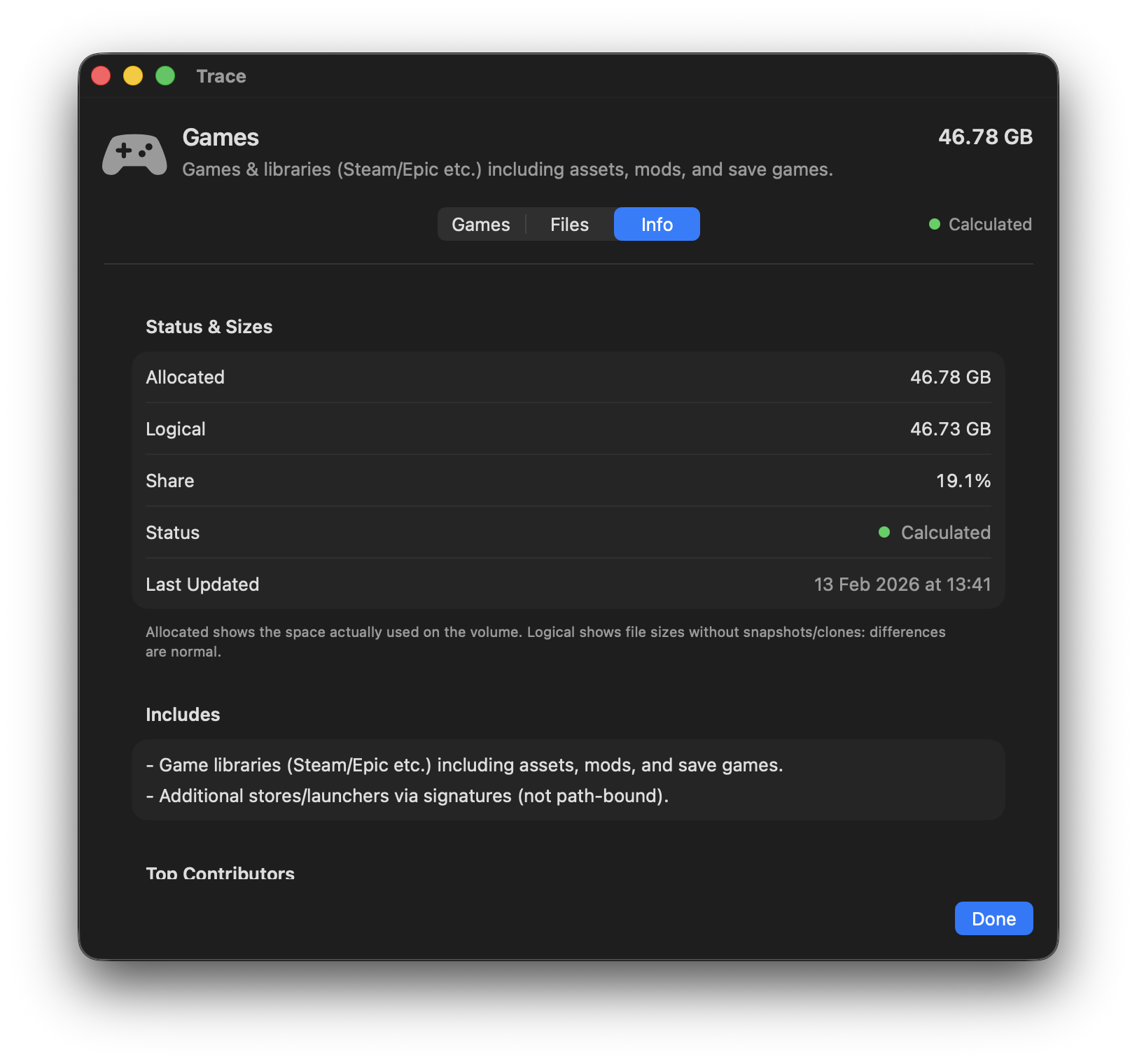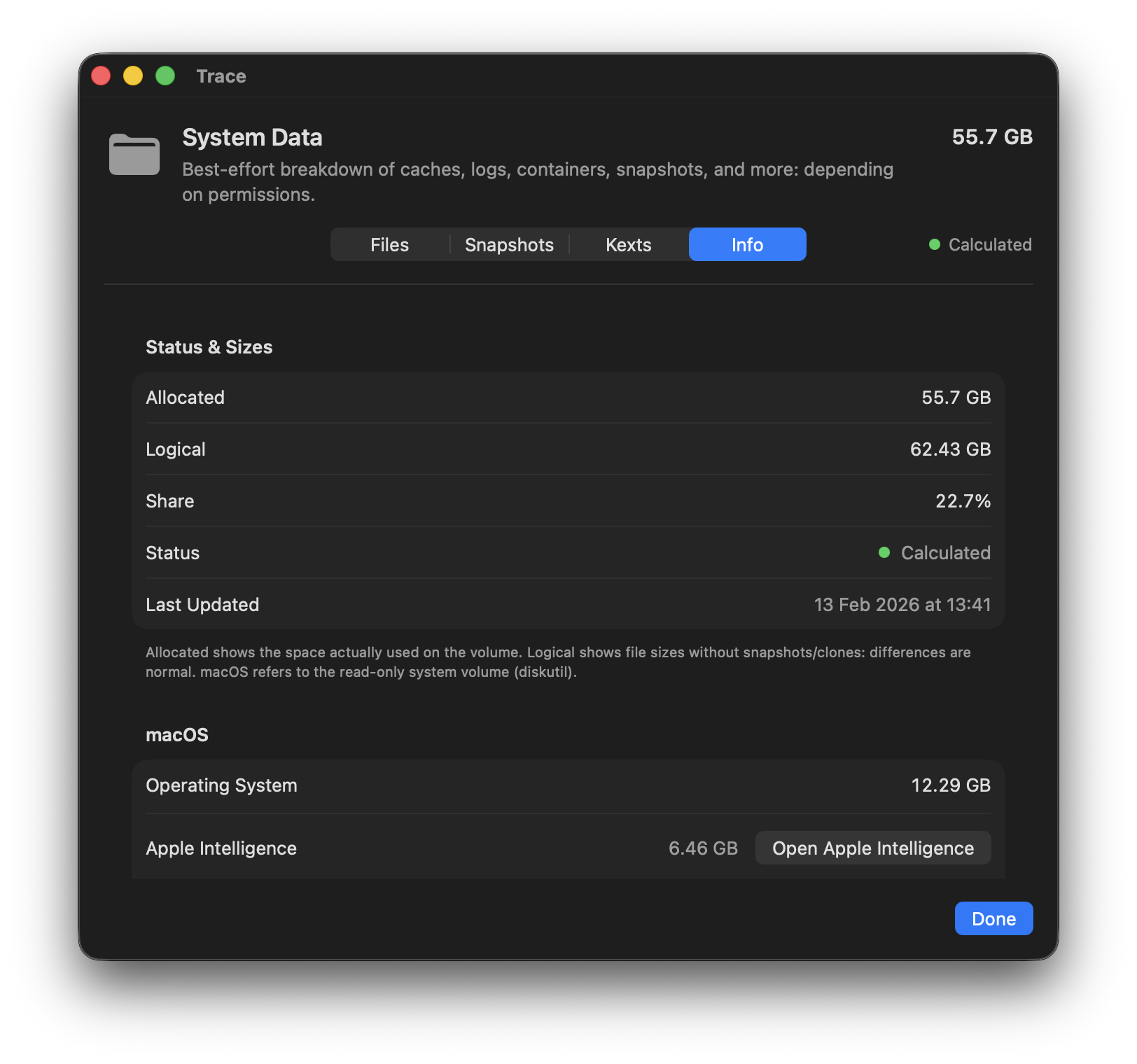 macOS nutzt interne Heuristiken und andere Kategorien. Trace rechnet präziser auf Dateiebene und verwendet eigene, transparente Kategorien. Mehr in der Dokumentation.